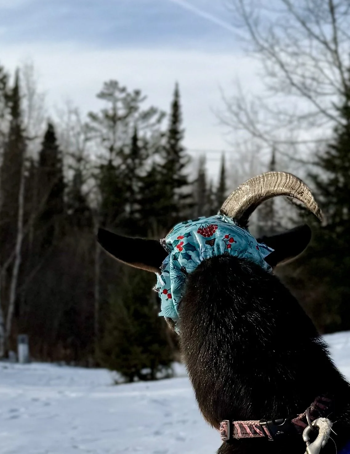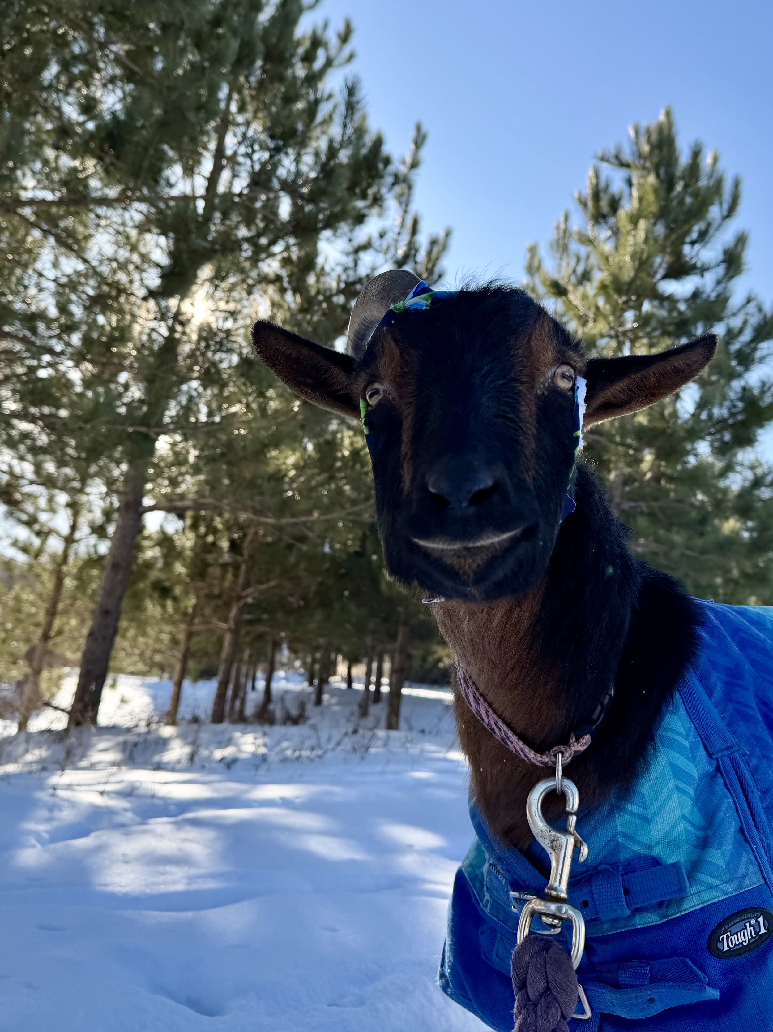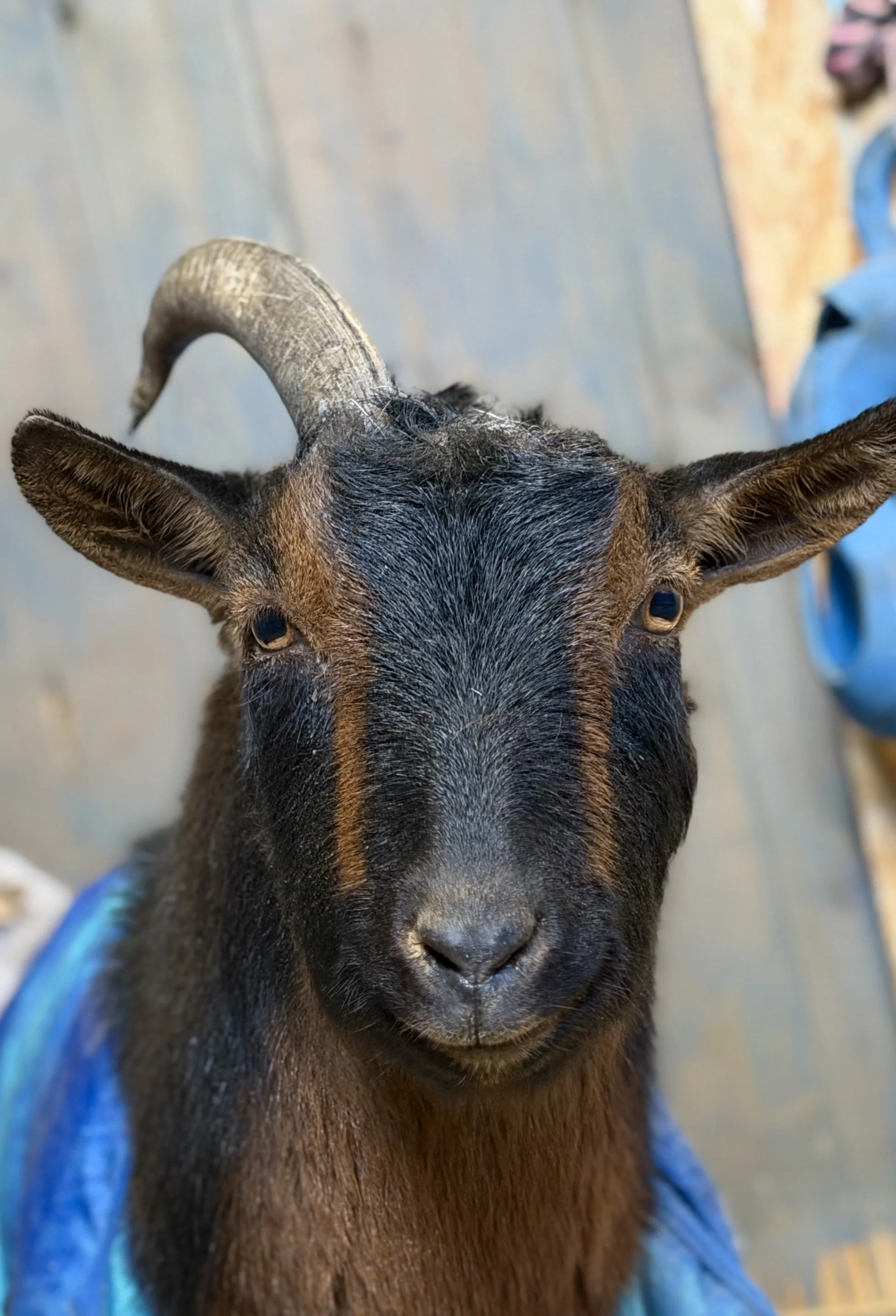 Apollo, a 3–4-year-old Nigerian Dwarf wether, came to us the day after Thanksgiving in significant pain after improper horn banding caused severe damage to both of his horns. The bands had likely been in place for an extended period, cutting off circulation and leading to infection and tissue loss. Upon arrival, he was placed in quarantine and immediately started on pain management, antibiotics, and intensive wound care under the guidance of Dr. Lexi.