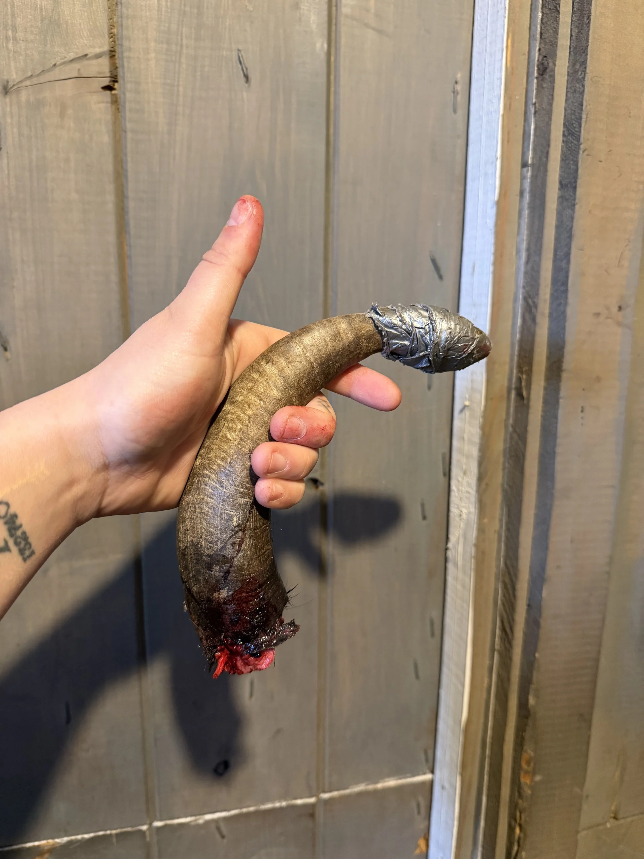 One horn eventually detached due to the extent of the damage, leaving an exposed sinus cavity that required careful packing, protection, and close monitoring. The second horn also required treatment and ongoing observation. His recovery involved weeks of diligent cleaning, medication, and veterinary follow-up to ensure proper healing and prevent further complications.